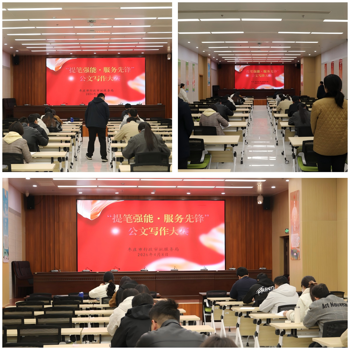 为深入贯彻落实全市“服务企业年”动员大会精神,全面提升机关干部“以文辅政、服务发展”的能力水平,4月8日下午,市审批服务局“提笔强能·服务先锋”公文写作比赛在枣庄市民中心北区多功能东会议室成功举办。来自局“写作兴趣小组”的17名年轻干部同台竞技、以笔为媒,锤炼“看家本领”,展现审批风采。
